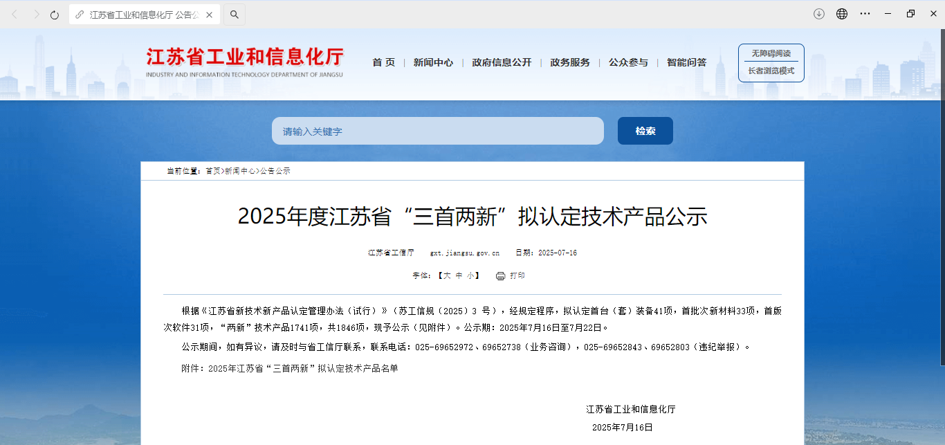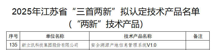 近日,江蘇省工信廳《2025年度江蘇省“三首兩新”擬認(rèn)定技術(shù)產(chǎn)品名單》公布,新立訊科技集團(tuán)《安全溯源產(chǎn)地信息管理系統(tǒng)V1.0》位列“兩新技術(shù)產(chǎn)品”名單中。