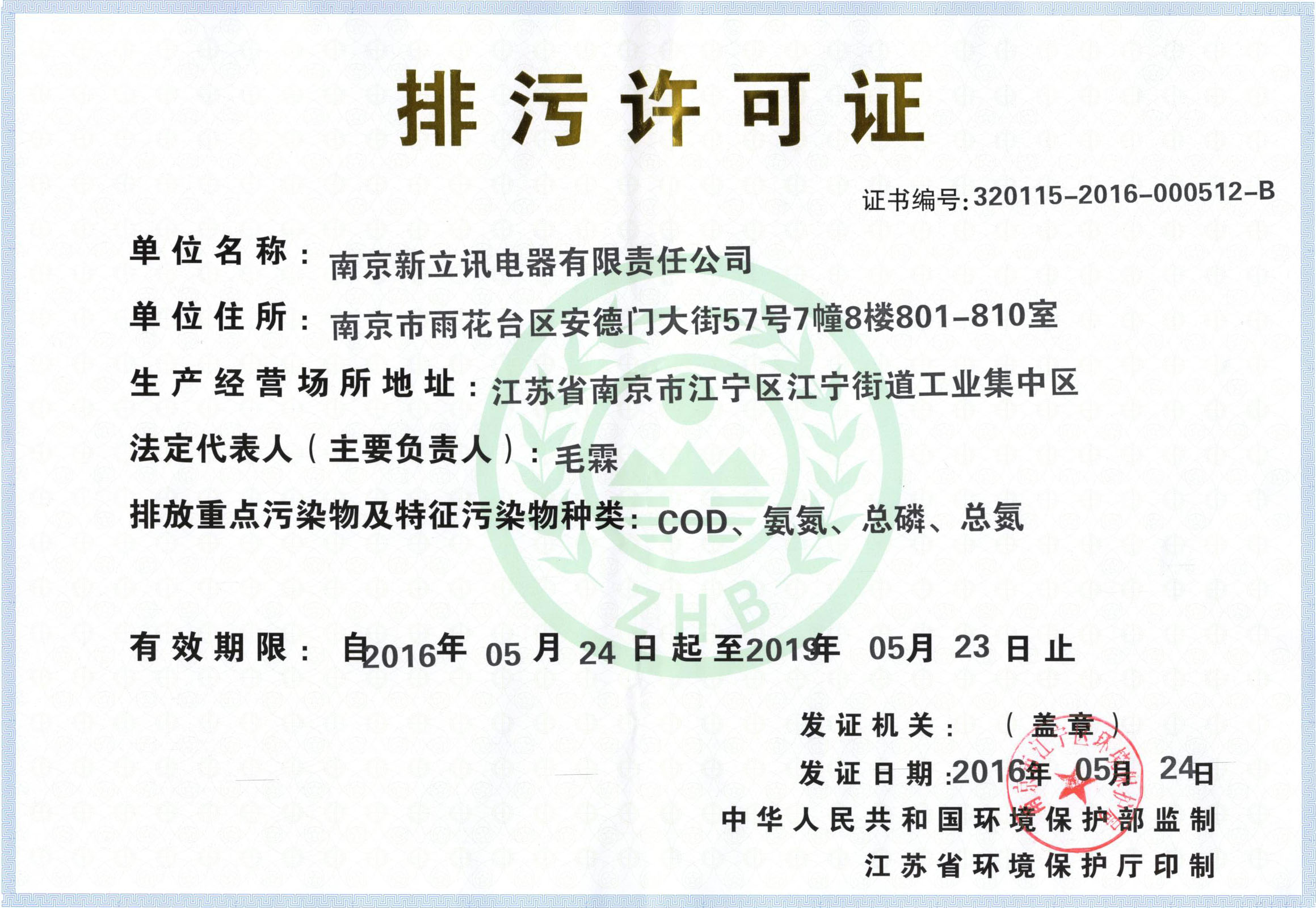 2016年5月24日,南京新立訊電器有限責任公司獲得江蘇省環(huán)境保護廳頒發(fā)的最新版排污許可證。南京新立訊電器有限責任公司成立以來,領(lǐng)導班子高度重視環(huán)境保護工作,多次就環(huán)保驗收及排污許可證的取得等事宜進行安排部署,極大地促進此項工作的完成。