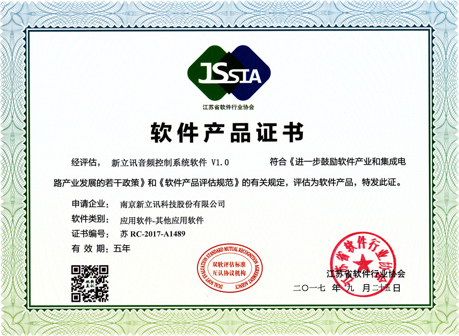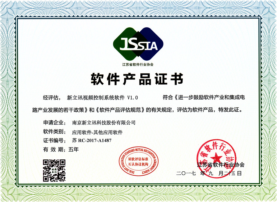 經江蘇省軟件行業協會的嚴格審核,南京新立訊公司符合《進一步鼓勵軟件產業和集成電路產業發展的若干政策》和《軟件企業評估規范》的有關規定,被認定為軟件企業。目前我司擁有知識產權67項,軟件產品證書9項,其中3項分別為新立訊視頻控制系統軟件V1.0(證書編號:蘇RC-2017-A1487)、新立訊3D實景綜合控制平臺系統軟件V1.0(證書編號:蘇RC-2017-A1488)和新立訊音頻控制系統軟件V1.0(證書編號:蘇RC-2017-A1489)。