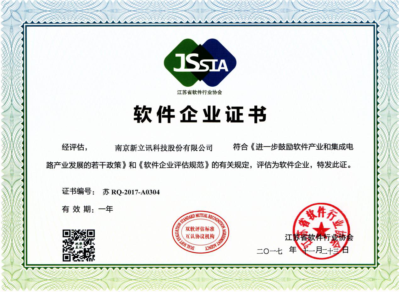 南京新立訊科技股份有限公司于近日獲得江蘇省軟件行業協會頒發《軟件企業認定證書》,證書編號:蘇 RQ-2017-A0304,發證日期為2017年11月23日。