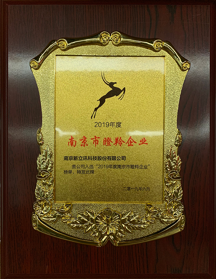 南京市委常委、常務副市長楊學鵬發布了《2019年南京市獨角獸、培育獨角獸、瞪羚企業名單及白皮書》,并為新增獨角獸、培育獨角獸代表、瞪羚企業代表頒發獎杯和獎牌。南京新立訊科技股份有限公司獲得“2019年度南京市瞪羚企業”榮譽稱號。