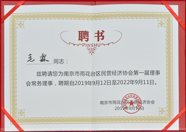 大會通過提名和投票的方式選舉出了會長、副會長、常務理事單位等,新立訊榮獲“南京市雨花臺區民營經濟協會副會長單位”,董事長毛霖先生被選舉聘任為第一屆常務理事、第一屆理事會副會長。
